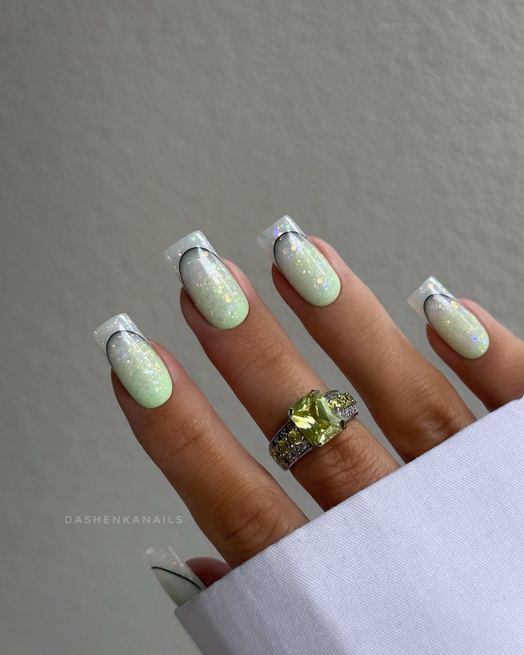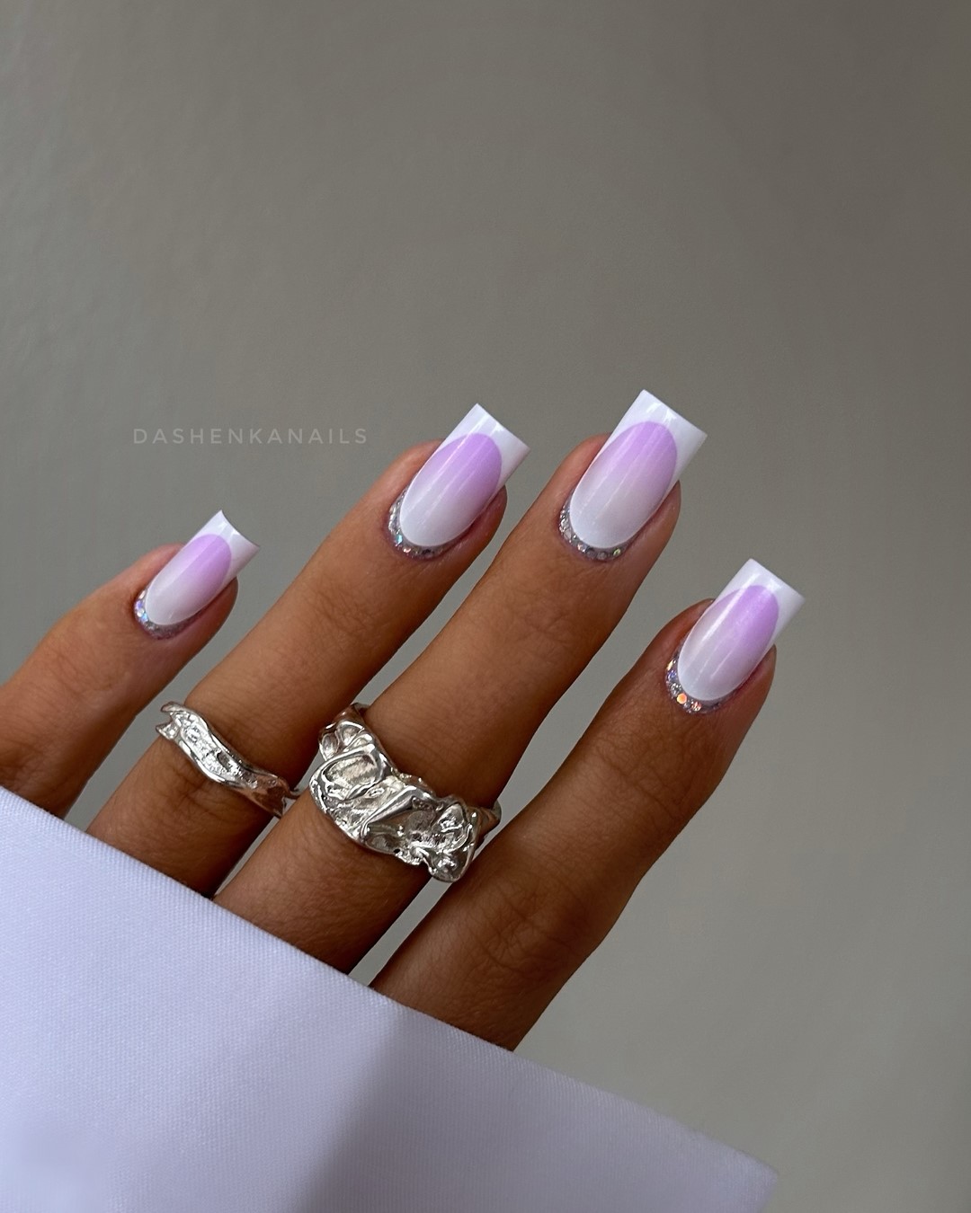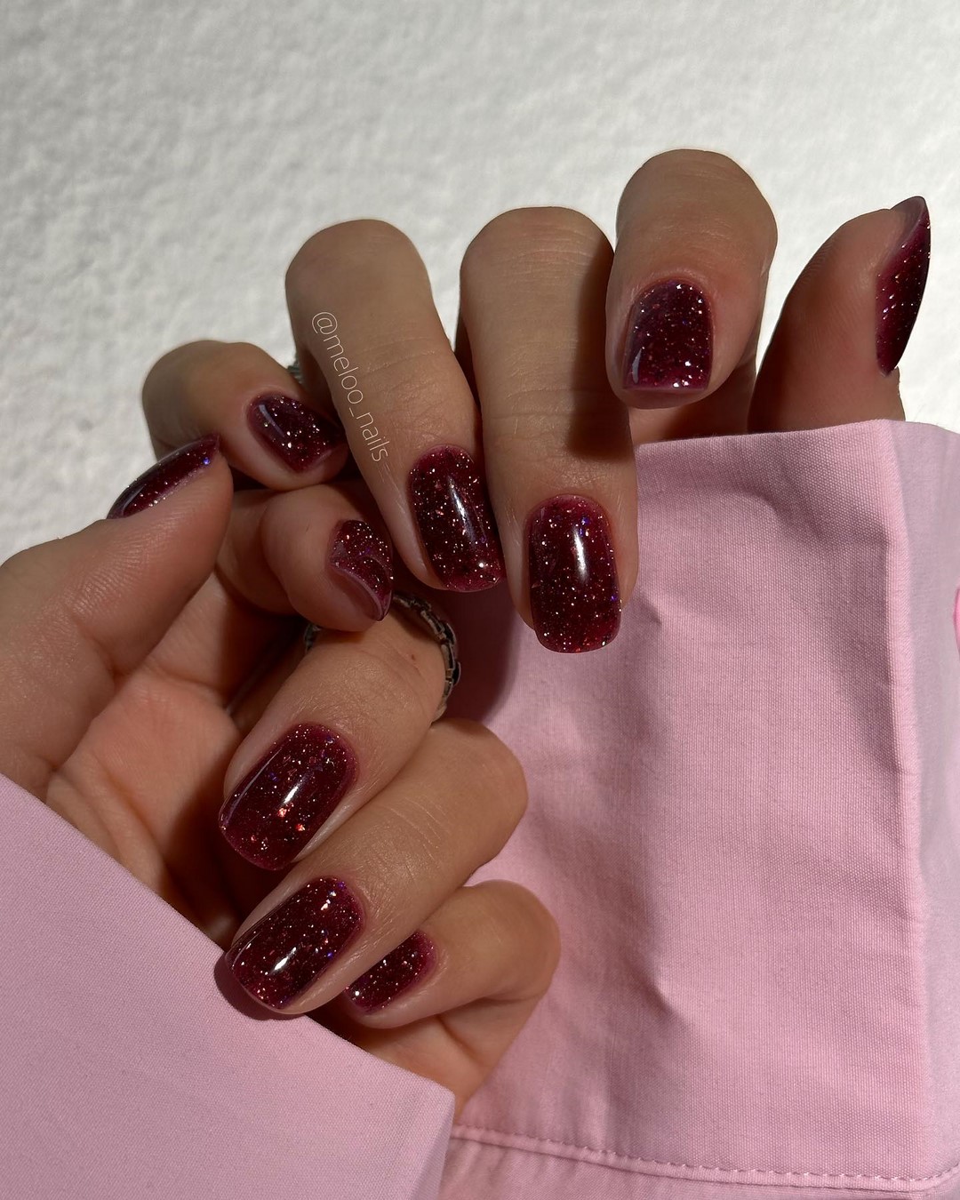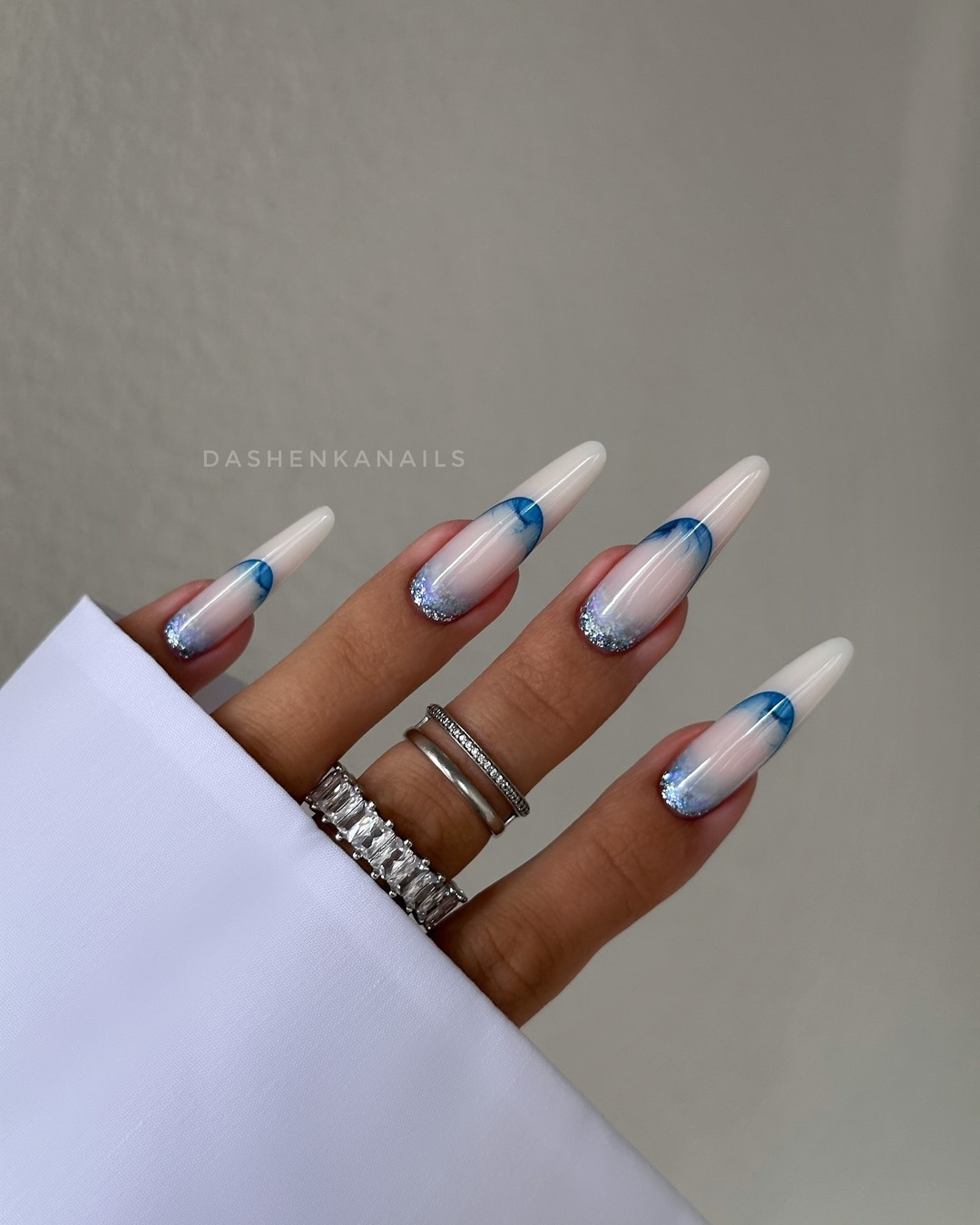 Этот тренд придает ногтям утонченный и сияющий вид, создавая эффект мерцающего обрамления. В моде как классические серебристые и золотистые блестки, так и цветные варианты. Можно делать плавный переход блесток к центру ногтя или оставлять их исключительно у основания. Такой дизайн идеально подходит для вечерних мероприятий, но в умеренной подаче может использоваться и в повседневных образах.