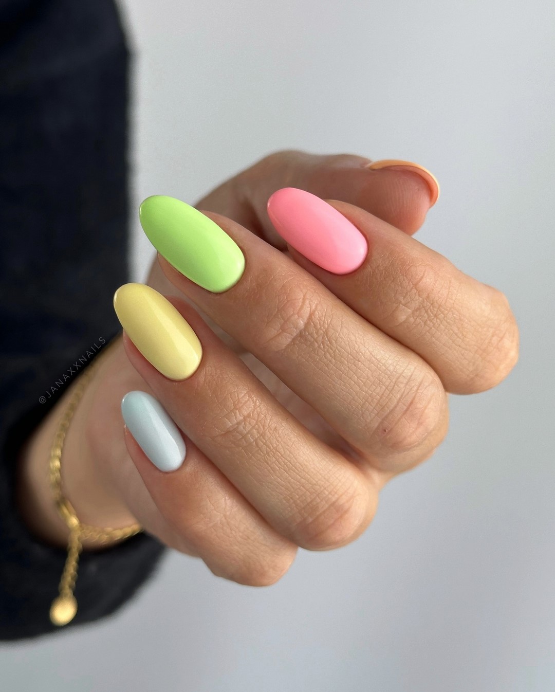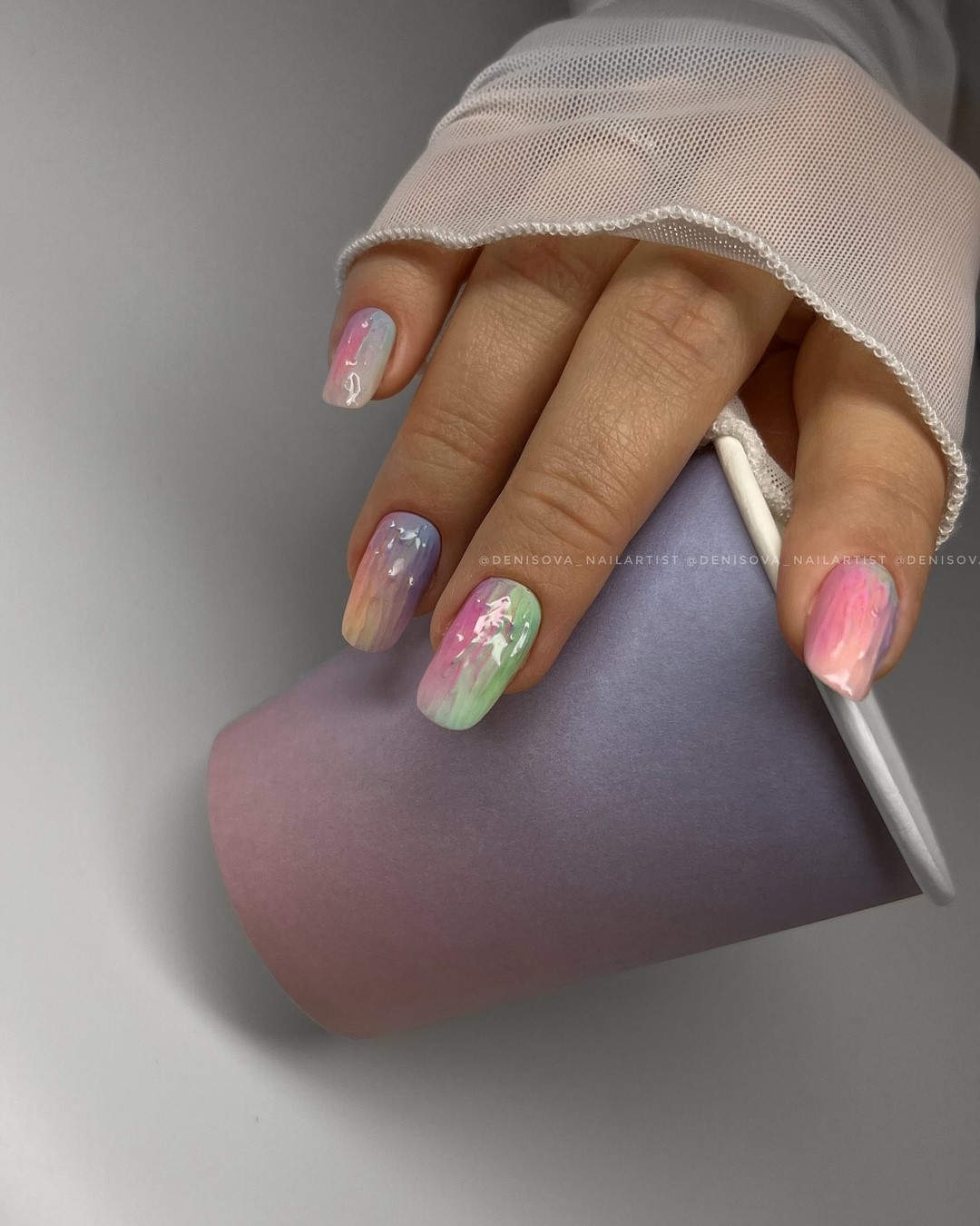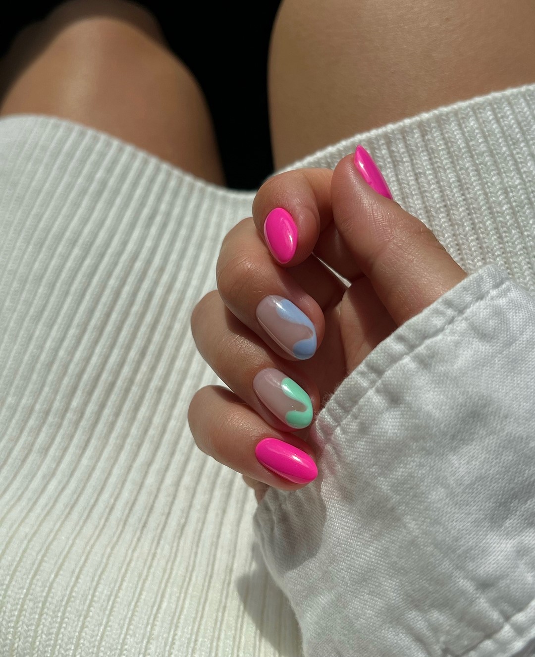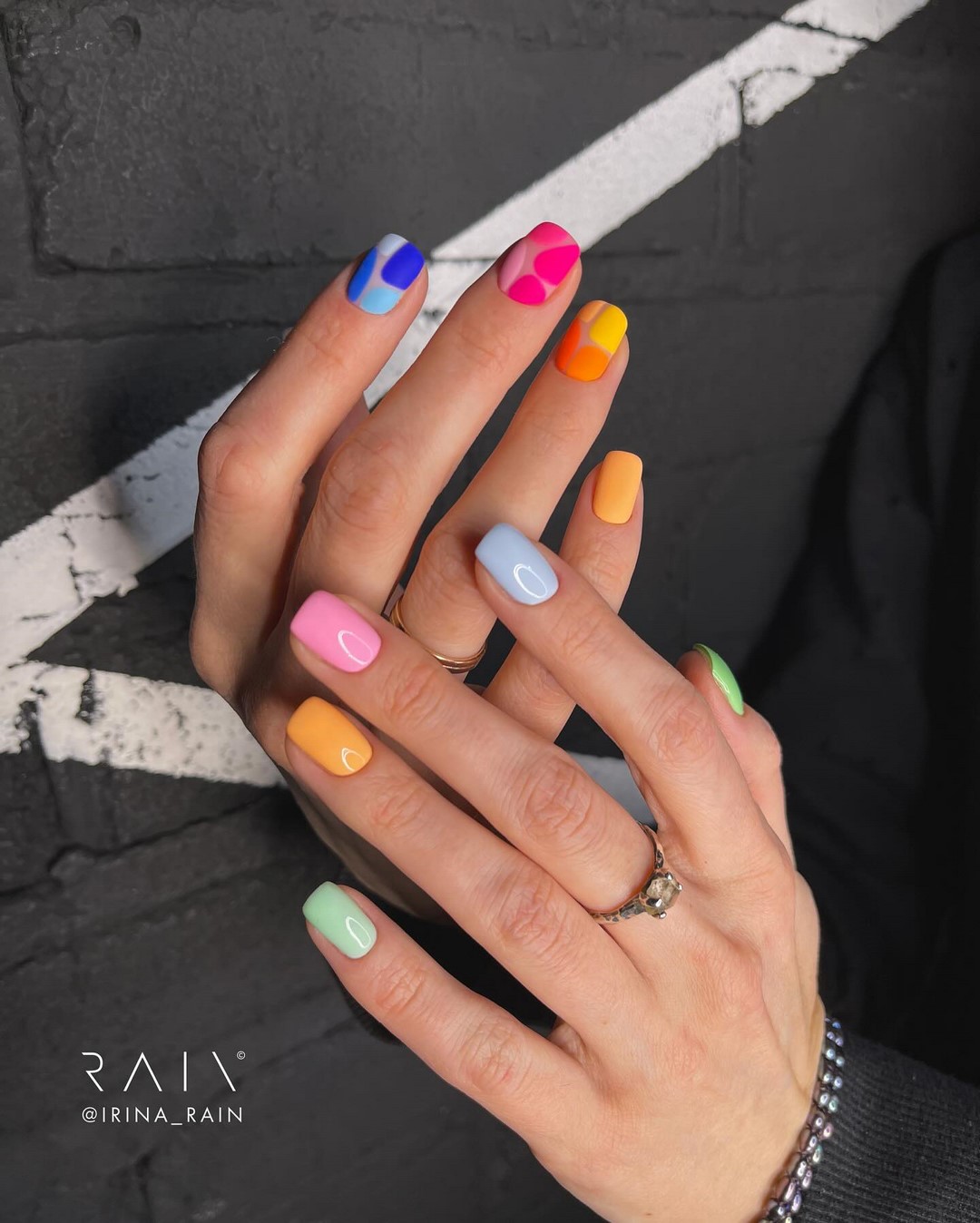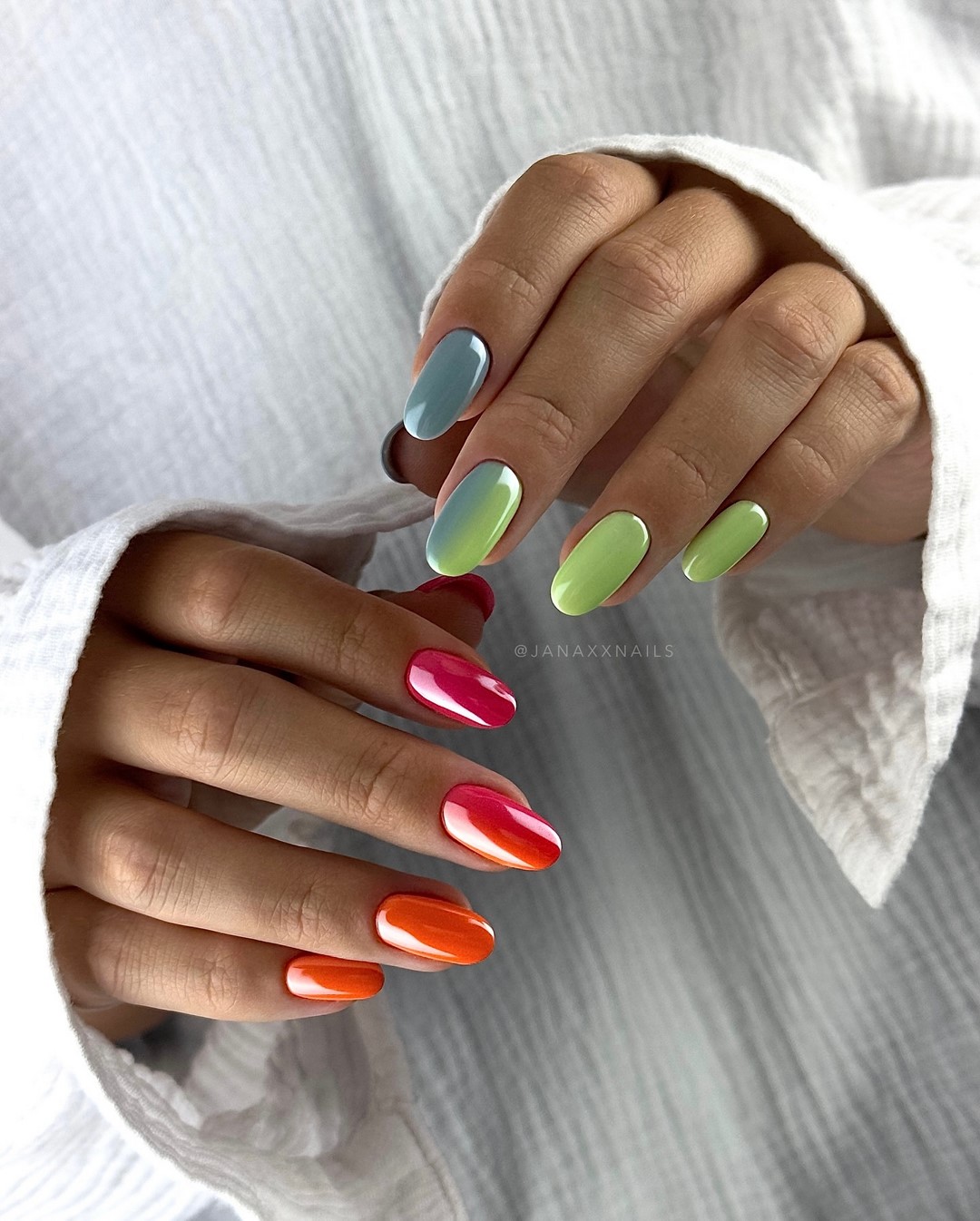 Разноцветный маникюр – идеальный вариант для теплого сезона, позволяющий экспериментировать с палитрой. В 2025 году тренд на сочетание нескольких ярких оттенков на одной руке или на отдельных ногтях сохраняется. Особенно популярны мягкие градиенты, эффект «разного лака» на каждом пальце и комбинации контрастных цветов. Разноцветный маникюр отлично подходит для летних образов и подчеркивает индивидуальность.