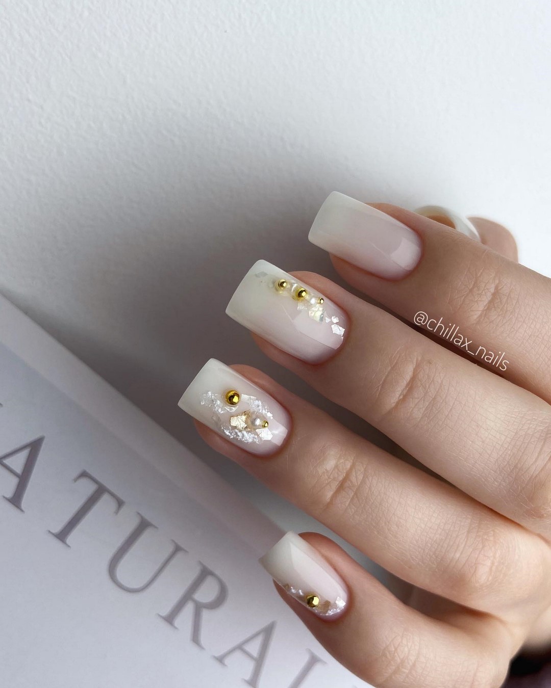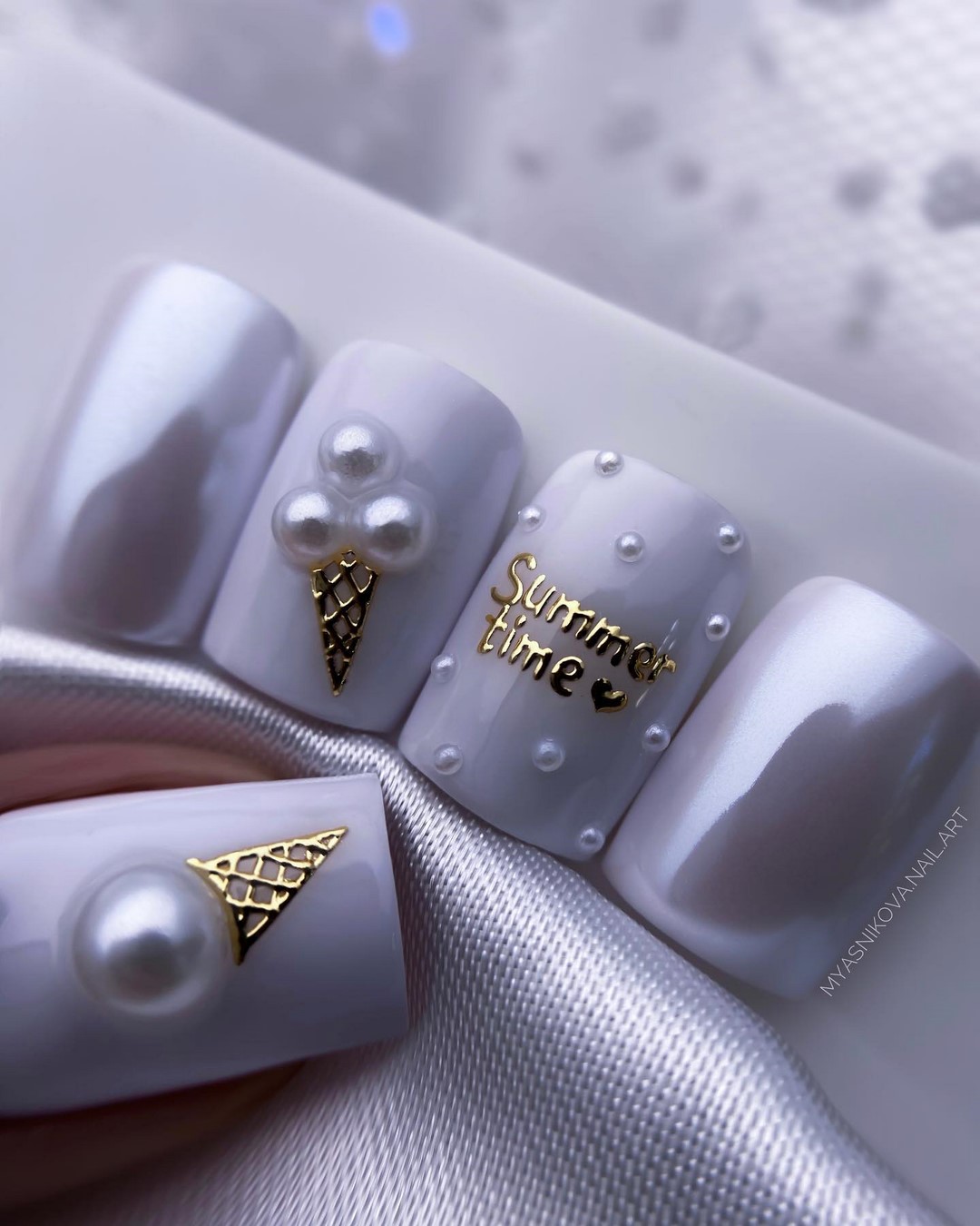 Маникюр с жемчужинами воплощает элегантность и утонченность. В моде аккуратные жемчужные бусины у основания ногтя, хаотично разбросанные элементы или градиентный эффект с блестящей пудрой, имитирующей жемчуг. Особенно стильно смотрятся жемчужные акценты в сочетании с нюдовыми или прозрачными покрытиями. Такой дизайн отлично подходит как для повседневных, так и для вечерних образов.