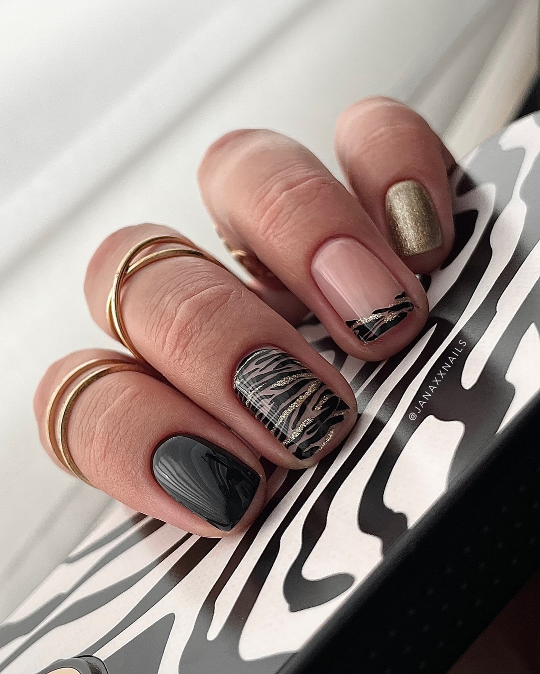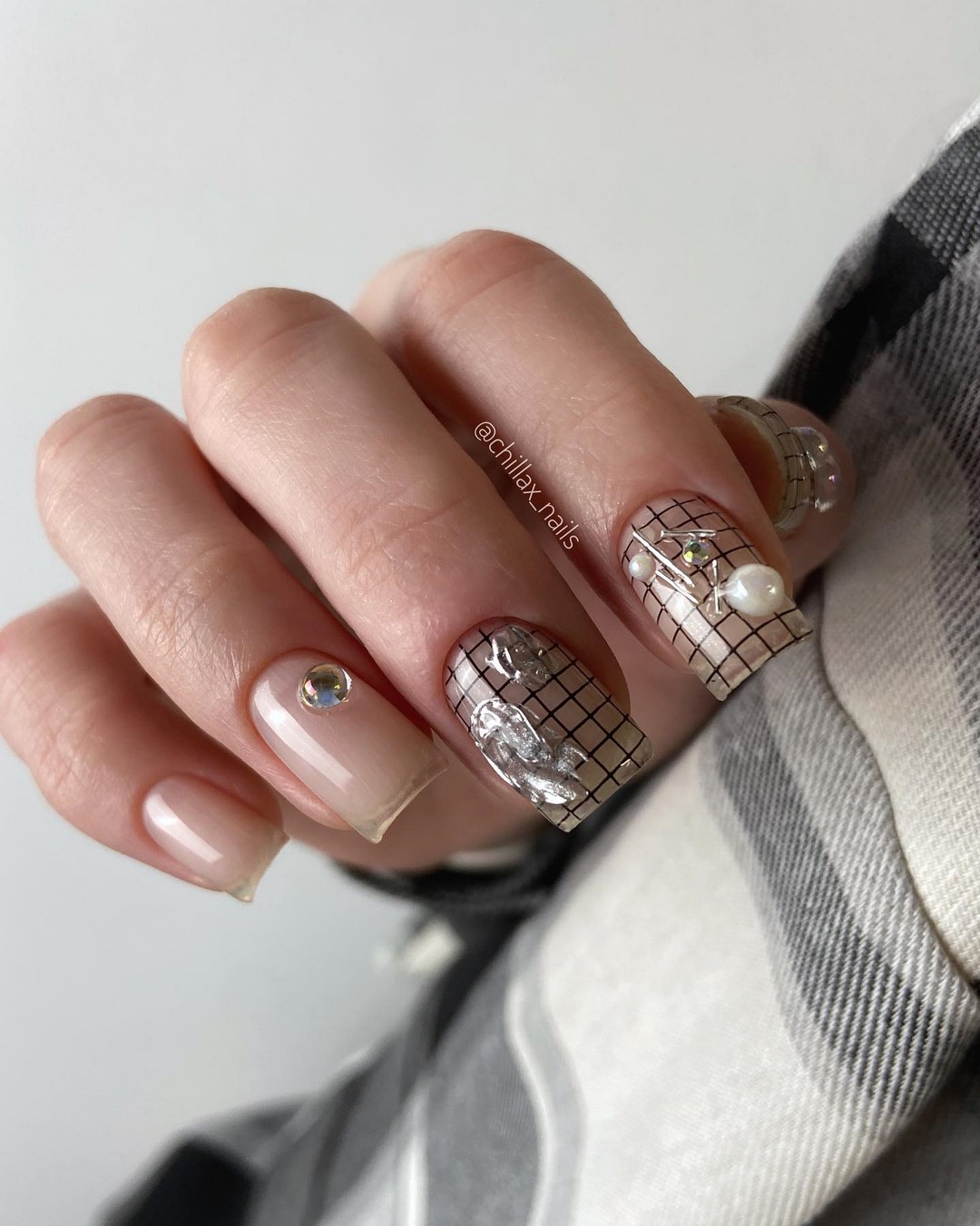 - Декор и украшения. Стразы, металлические вставки, золотистые и серебряные акценты придают маникюру эффектность, но используются дозировано.