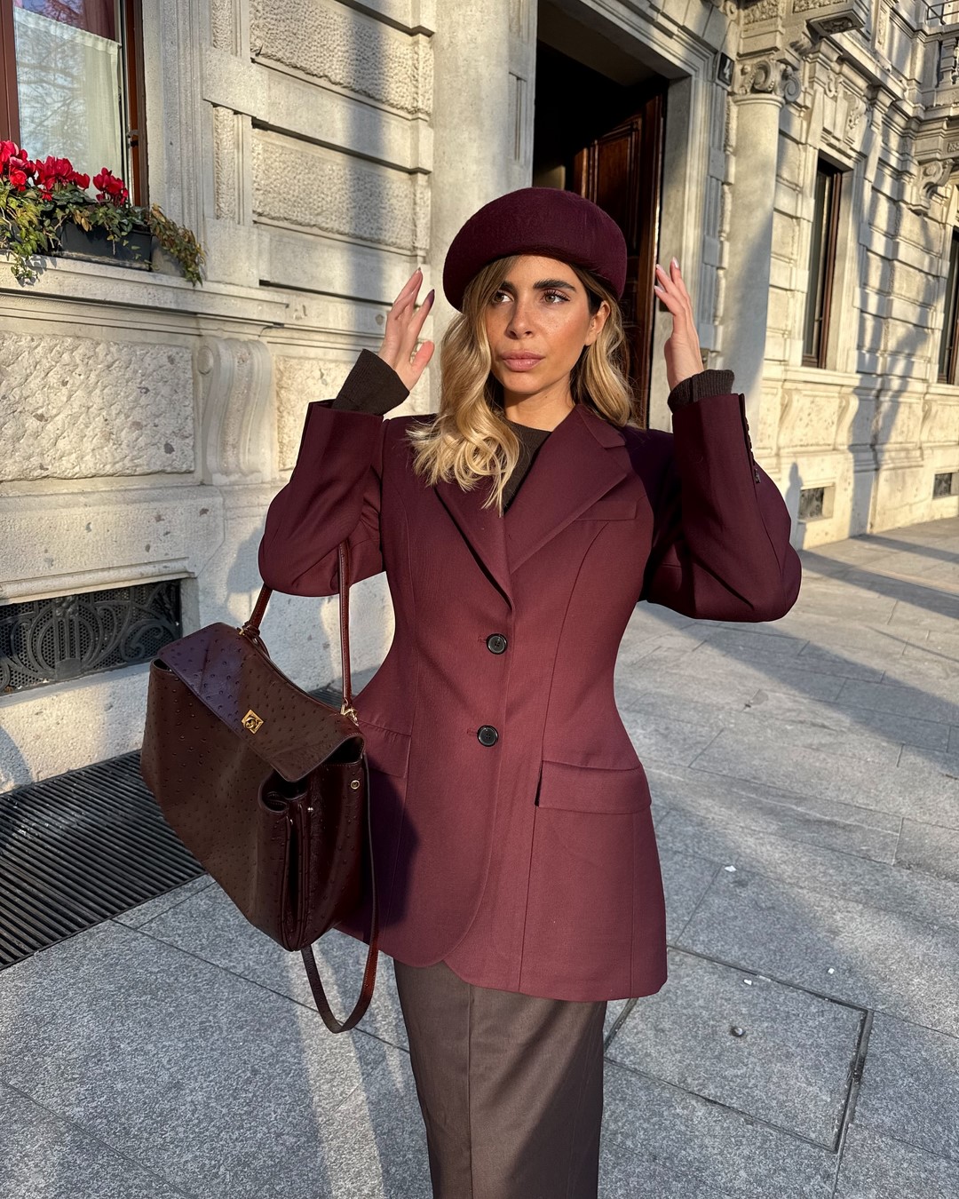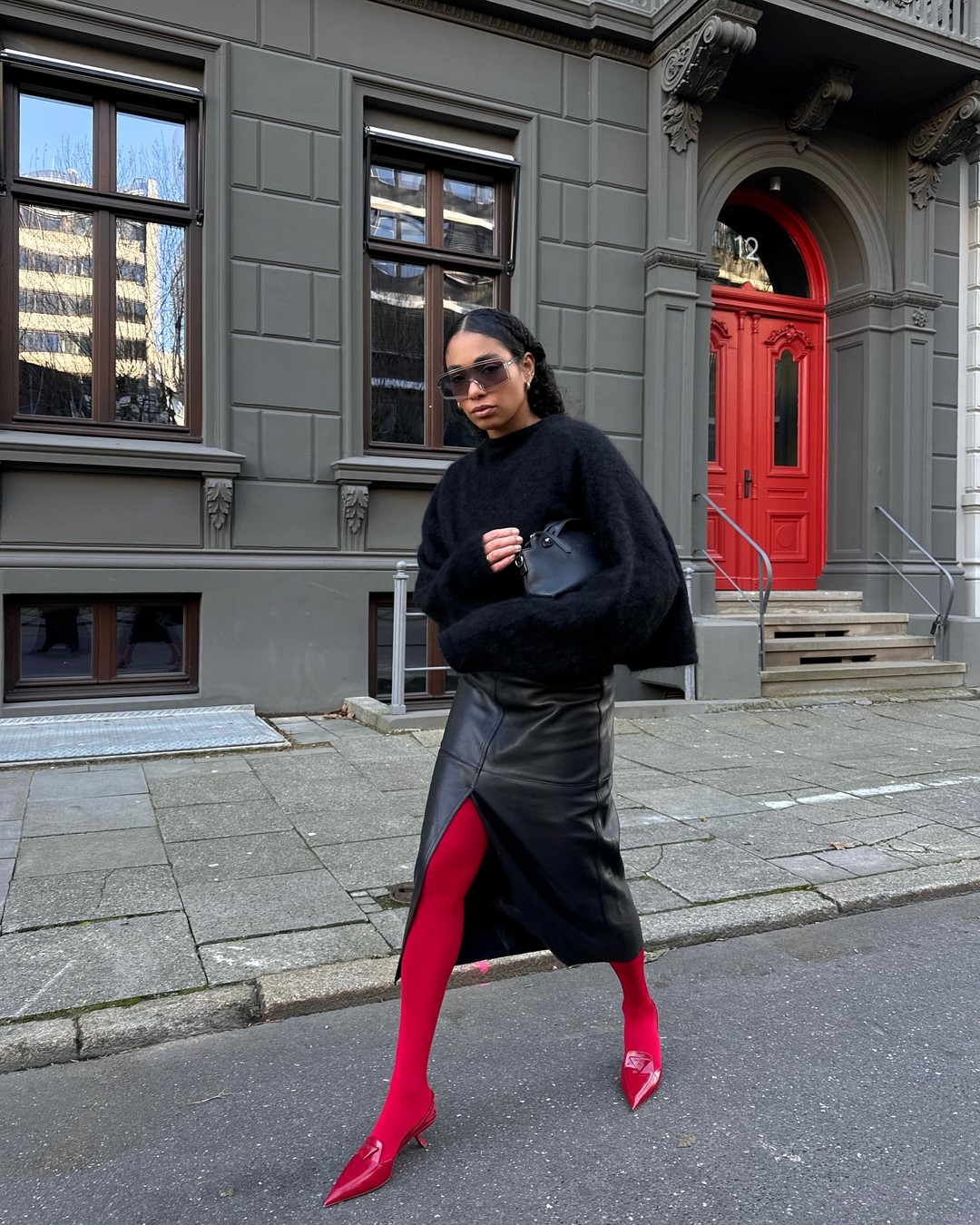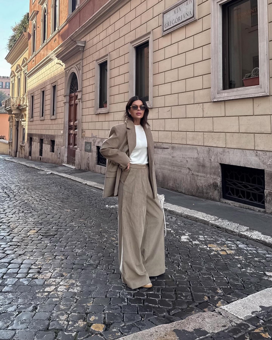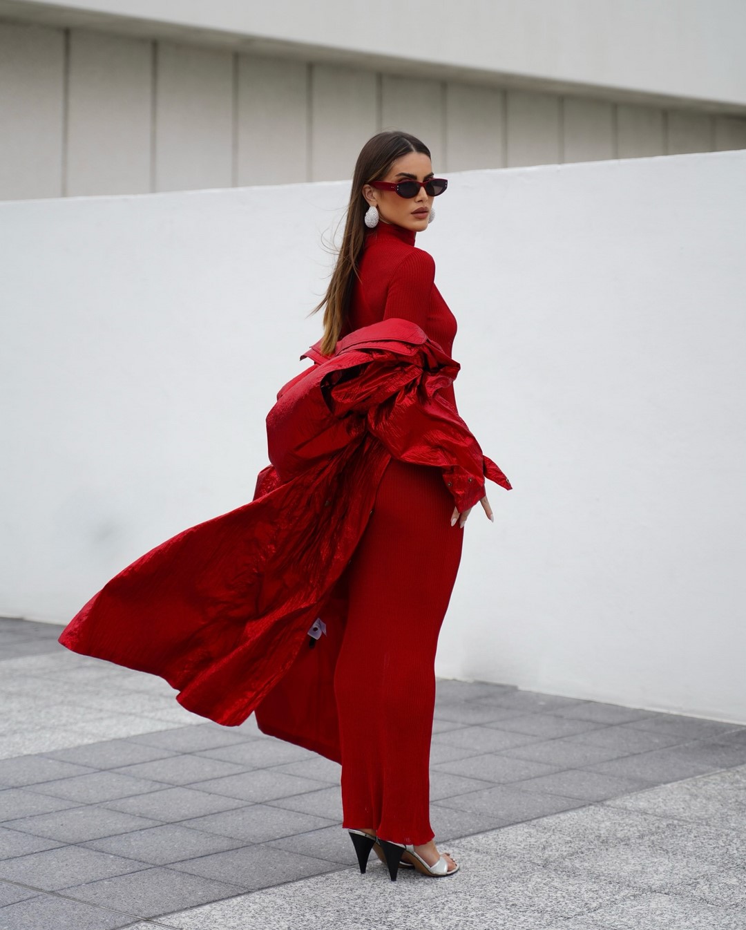 Образы в одном цвете остаются актуальными, особенно в мягких пастельных и глубоких насыщенных оттенках. Белый, черный, бежевый, серый и яркие акцентные цвета (красный, синий, зеленый) формируют стильные тотал-луки. Дизайнеры предлагают играть с текстурами и материалами, сочетая, например, кожу и трикотаж в одном оттенке. Такой прием делает образ цельным и элегантным, а также визуально стройнит силуэт.
