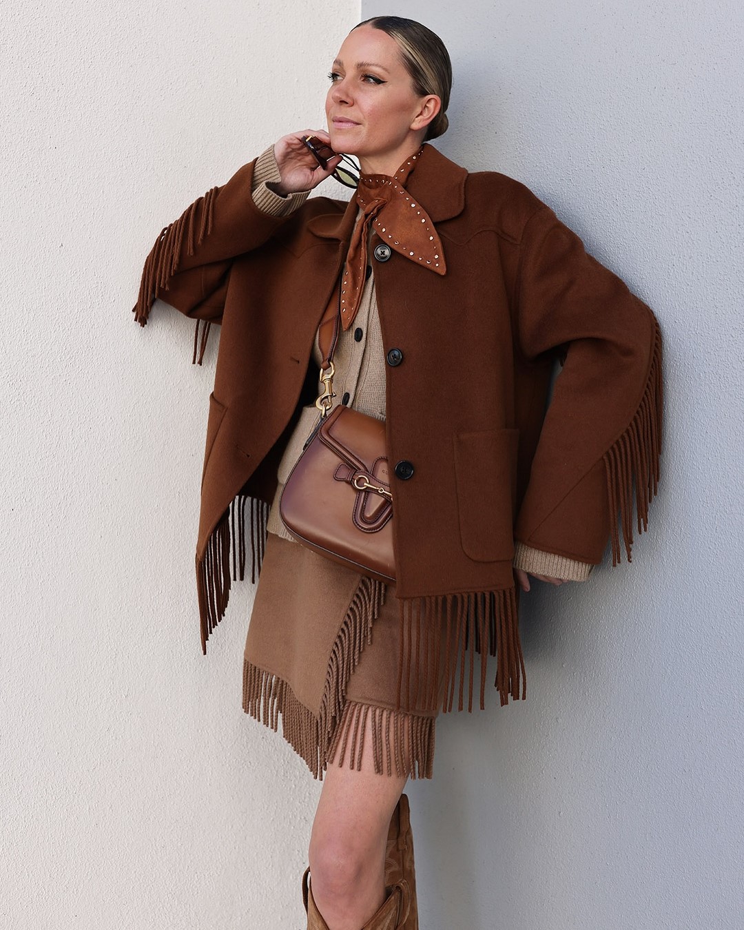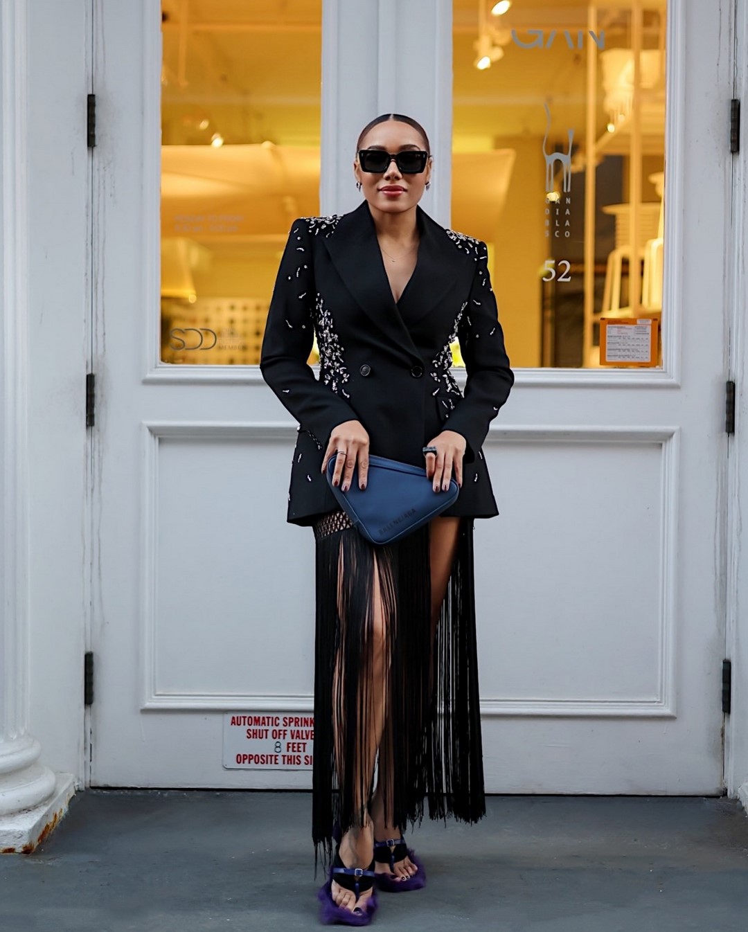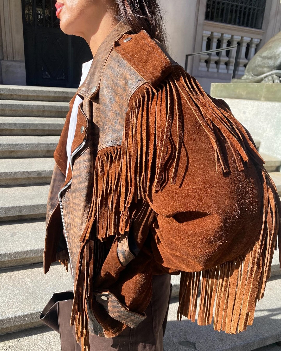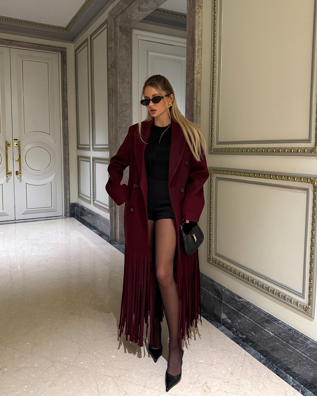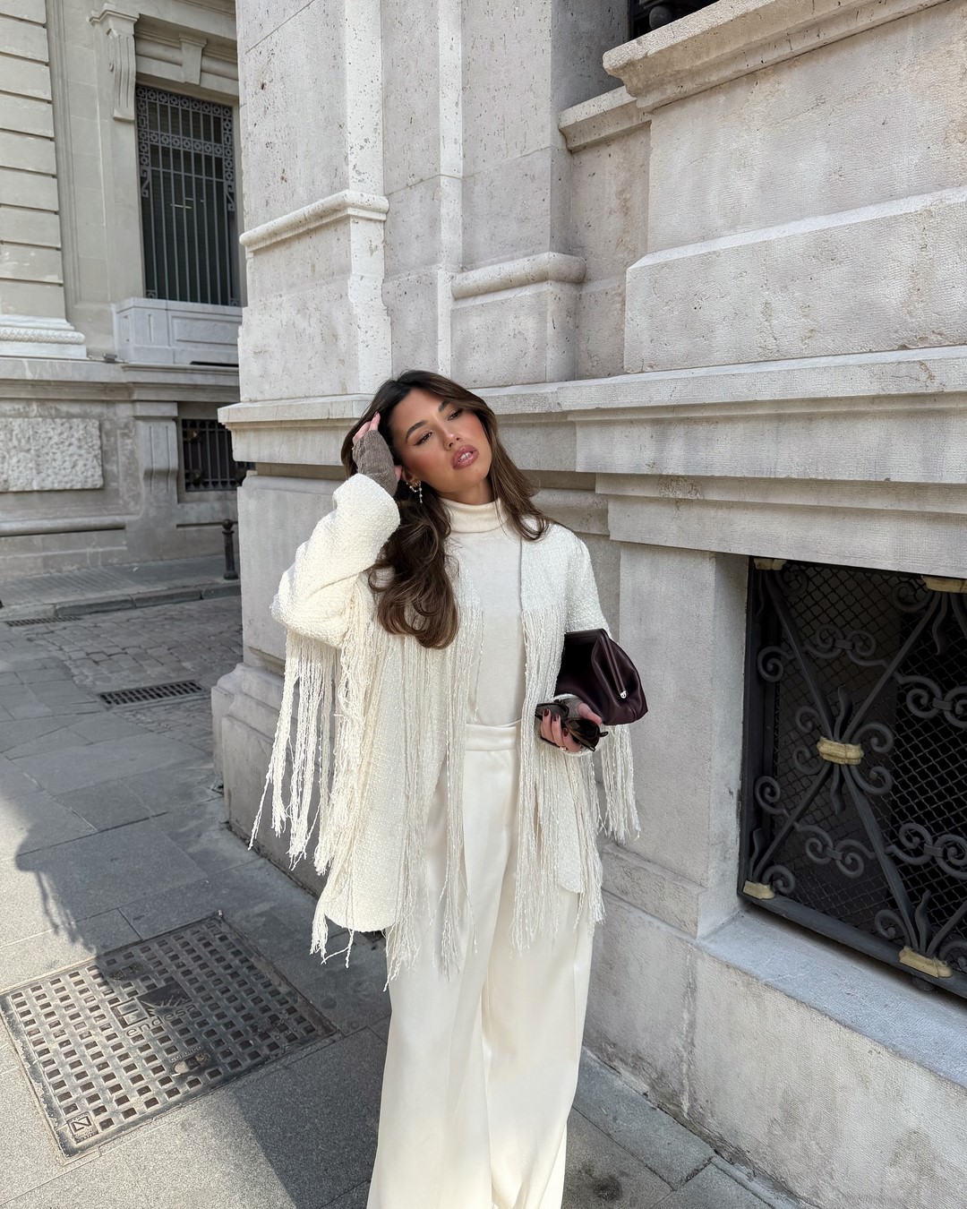 Бахрома остается ключевым декоративным элементом, добавляя динамику и движение в образ. В сезоне весна-лето 2025 она появляется на платьях, юбках, жакетах, сумках и даже обуви. Особенно актуальны модели с длинной бахромой, создающей эффект струящихся линий при движении. Такой элемент делает даже самые простые вещи более выразительными и яркими.