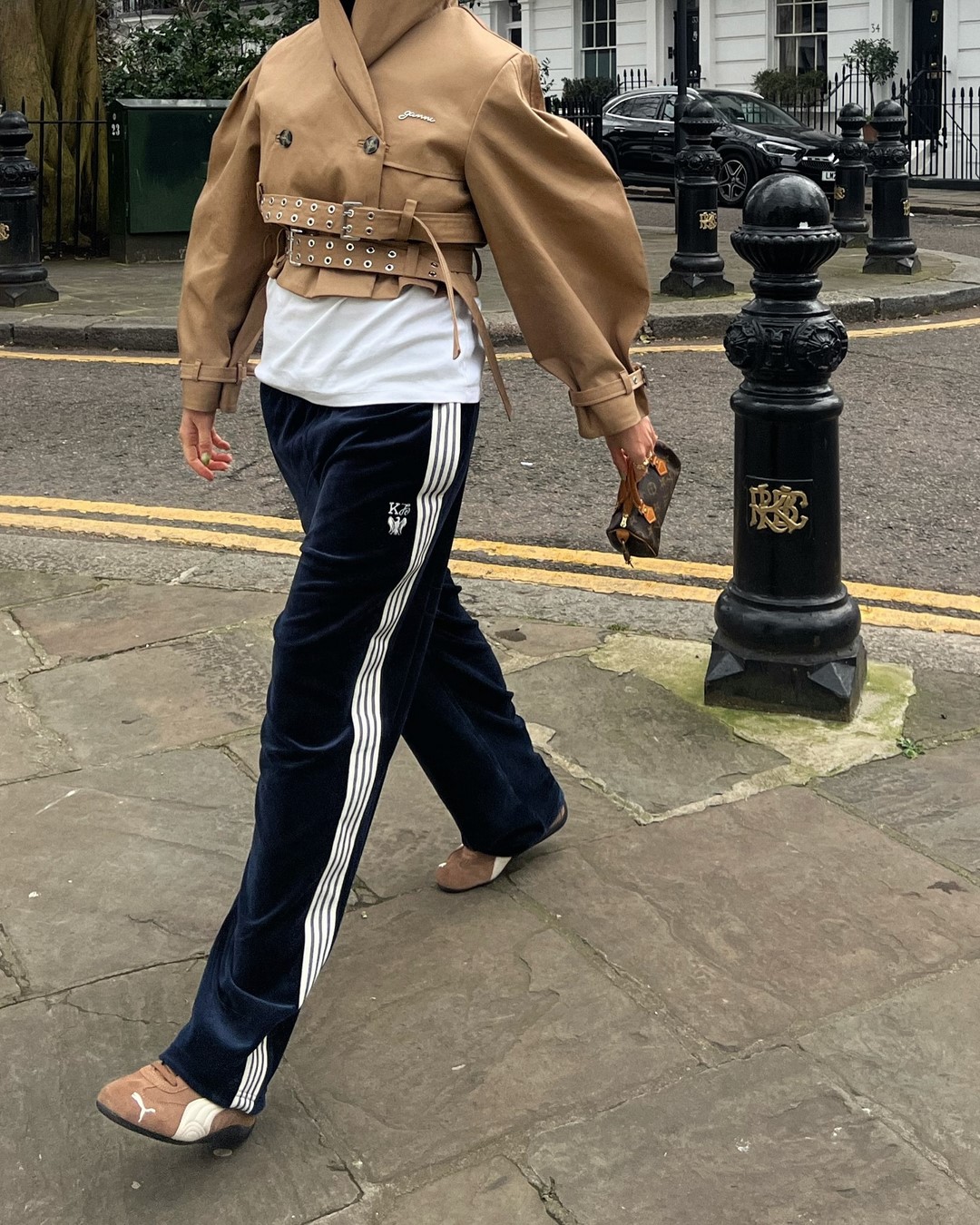 Элементы спортивного стиля гармонично интегрируются в повседневную моду, создавая расслабленный, но стильный эффект. В тренде широкие брюки с лампасами, кроп-топы, бомберы, кроссовки и сандалии на толстой подошве. Популярны комбинации спортивных деталей с классическими вещами, например, пиджаки с велосипедками или юбки с худи. Ключевыми материалами становятся нейлон, трикотаж и эластичные ткани, обеспечивающие комфорт.