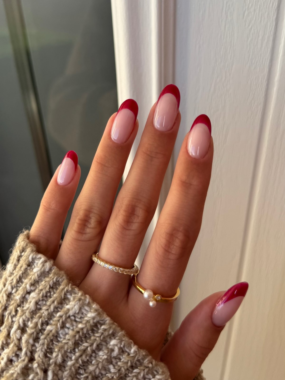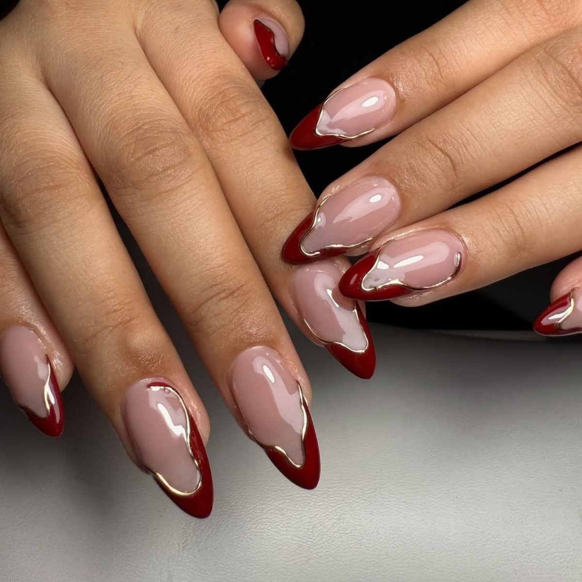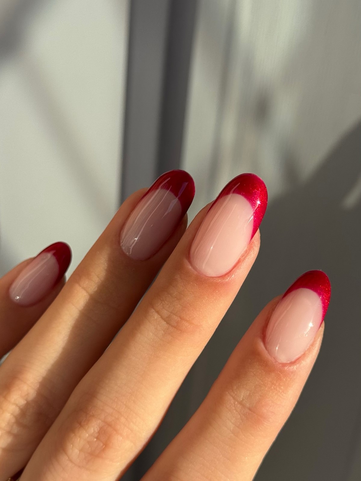 Красный френч в феврале 2026 выглядит элегантно и уверенно. Глубокие алые, винные и клюквенные оттенки создают эффект ухоженных и статусных ногтей. Такой дизайн прекрасно сочетается с нейтральной базой и минималистичным стилем одежды.