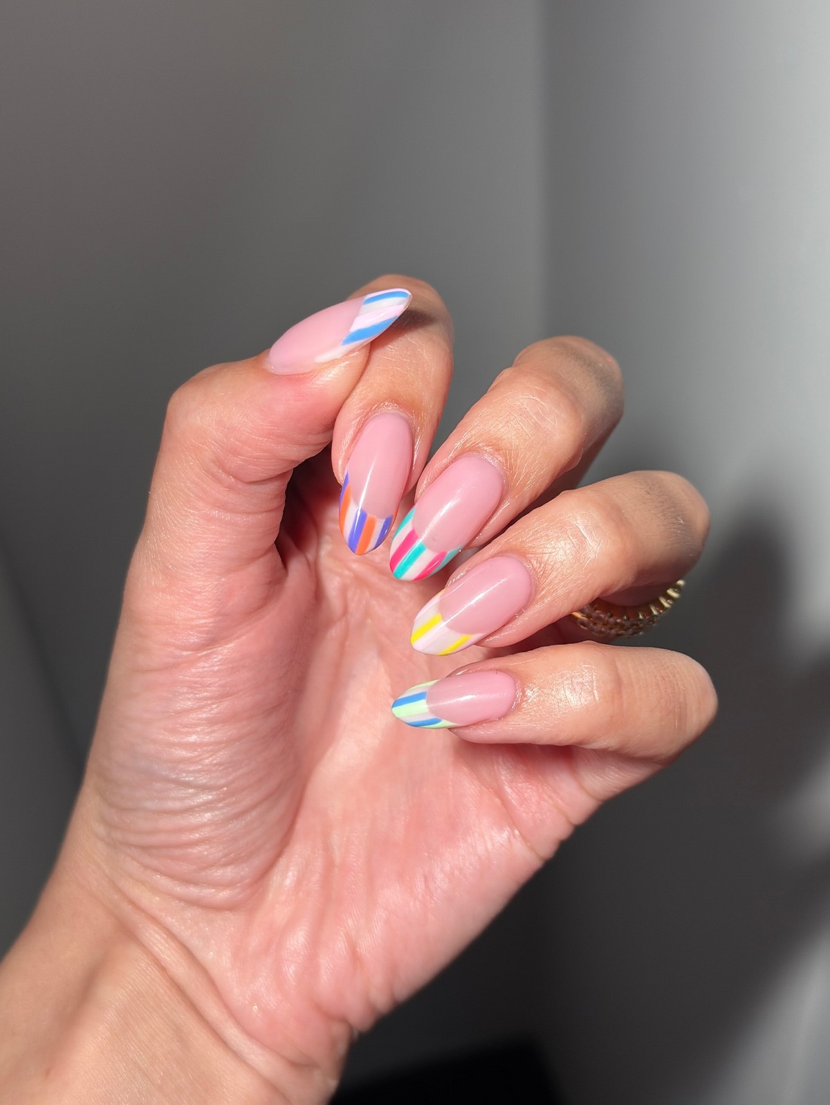 Френч с разноцветными пастельными полосками становится настоящим хитом февраля. Мягкие оттенки лаванды, молочного голубого, пудрово-розового и фисташкового создают легкое и романтичное настроение.