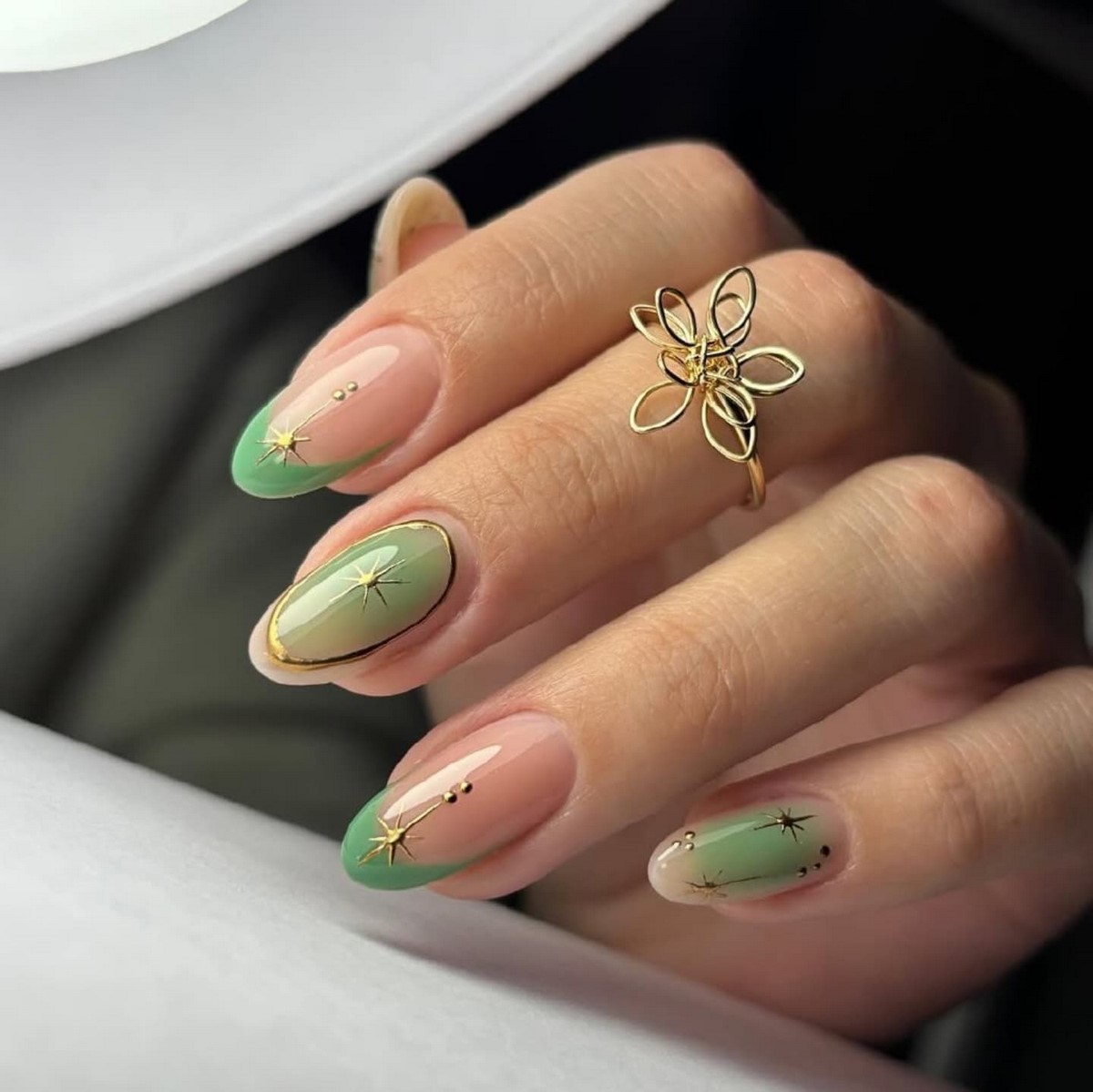 Фисташковая линия улыбки красиво контрастирует с молочной или полупрозрачной базой. Такой цветной френч идеально подойдет для тех, кто хочет выглядеть модно, но избегает слишком ярких решений.