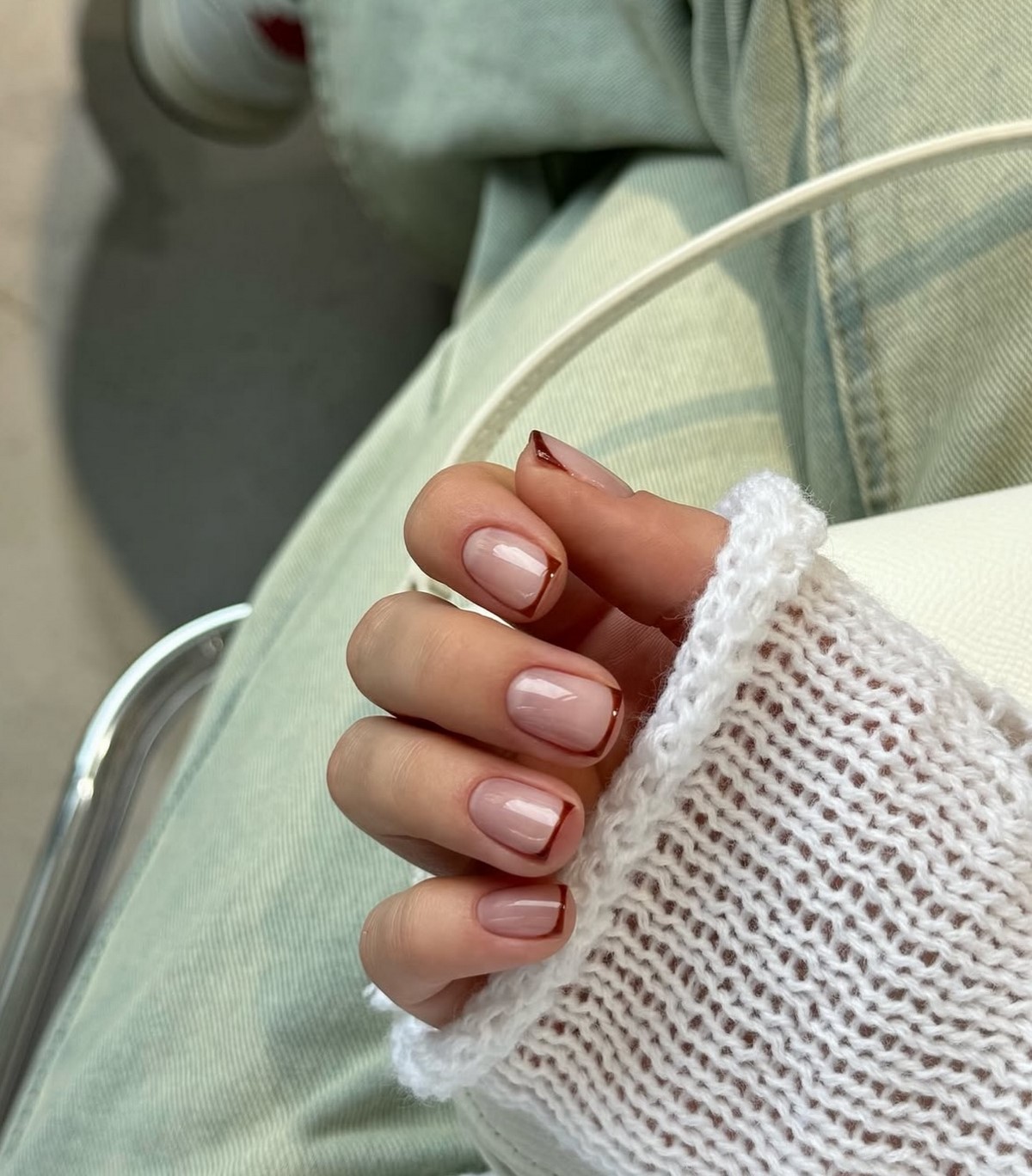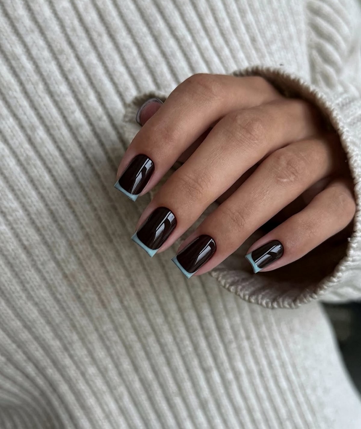 Этот вариант маникюра прекрасно сочетается с зимними текстурами в одежде и аксессуарами в бежево-коричневой гамме. Шоколадный френч подчеркивает вкус и выглядит дорого даже в самом лаконичном исполнении.