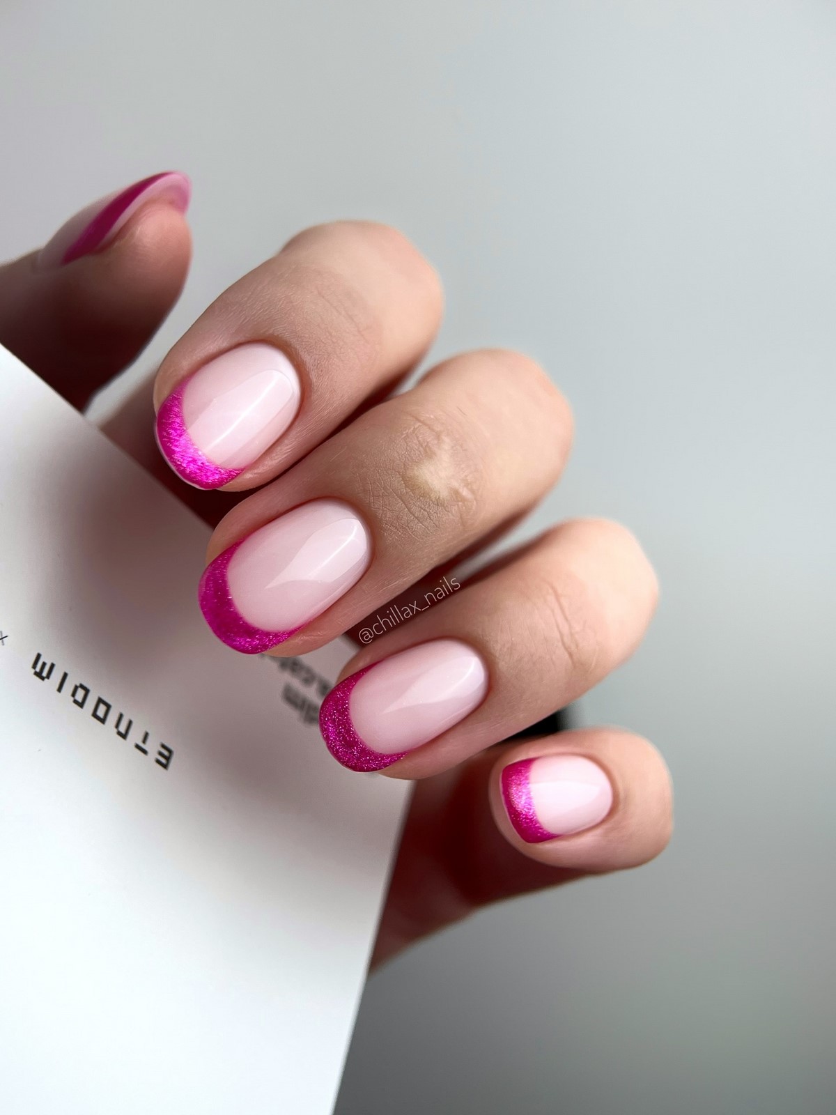 Эффект кошачьего глаза в розовой гамме делает цветной френч особенно выразительным. Магнитное сияние придает линии улыбки глубину и визуальный объем, создавая эффект движения света.
