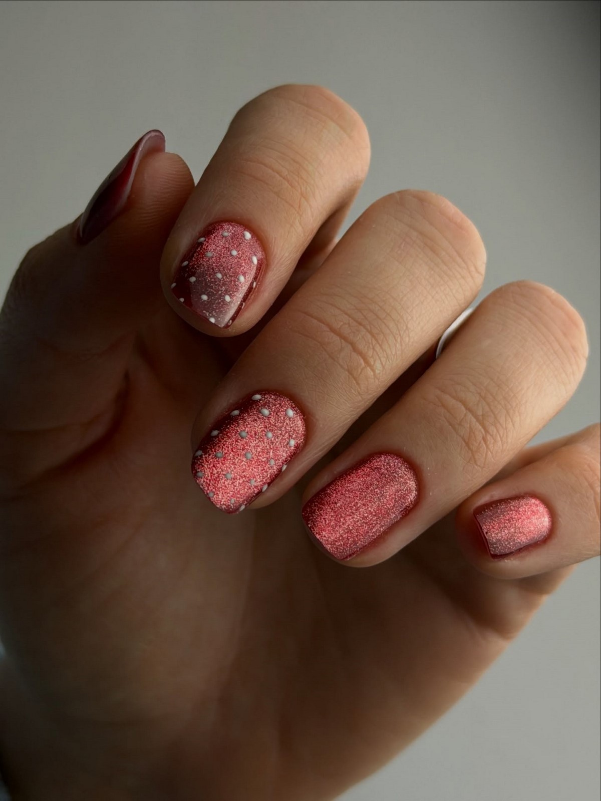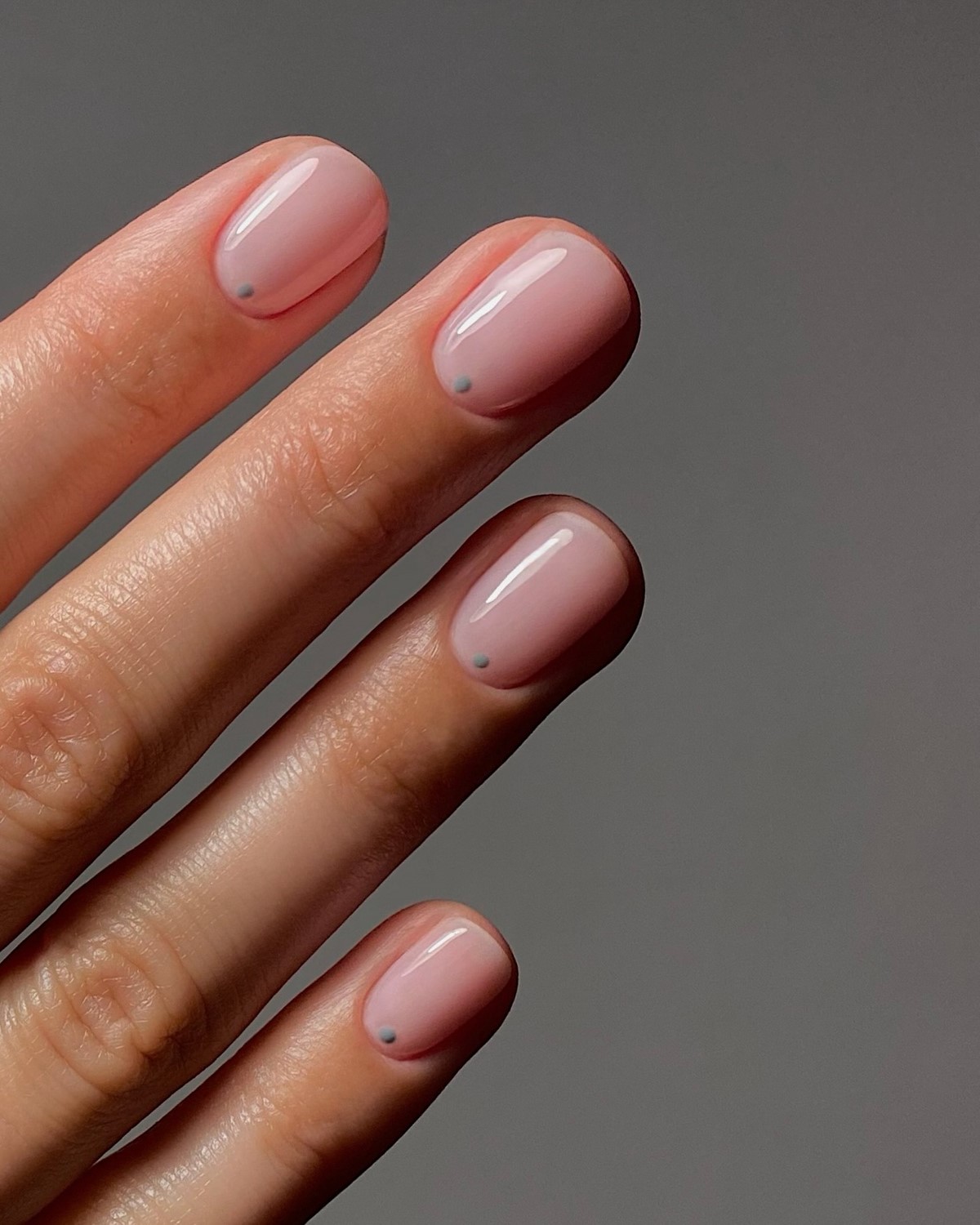 В феврале предпочтение отдается монохромным сочетаниям. Молочная база с серыми или бежевыми точками, прозрачное покрытие с белым горохом или пастельный фон с едва заметным декором выглядят свежо и аккуратно.